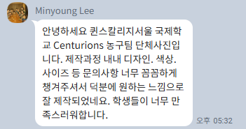 저희 유니폼을 입고 나가면 주변에서 “그 농구복 어디 거냐”는 질문을 꽤나 받으실 겁니다. 실제 지인 소개로 이어지는 오더가 많은 이유입니다. 가산디지털단지의 사무실로 내방해주시면, 빈손으로 보내지 않고 양말이라도 한 켤레 꼭 쥐여드립니다. 언제든 연락 주십시오. 여러분팀의 가장 빛나는 순간을 위해, 이 막내 디자이너 이규진 33세는 오늘도 기꺼이 수명을 단축할 준비가 되어 있습니다.